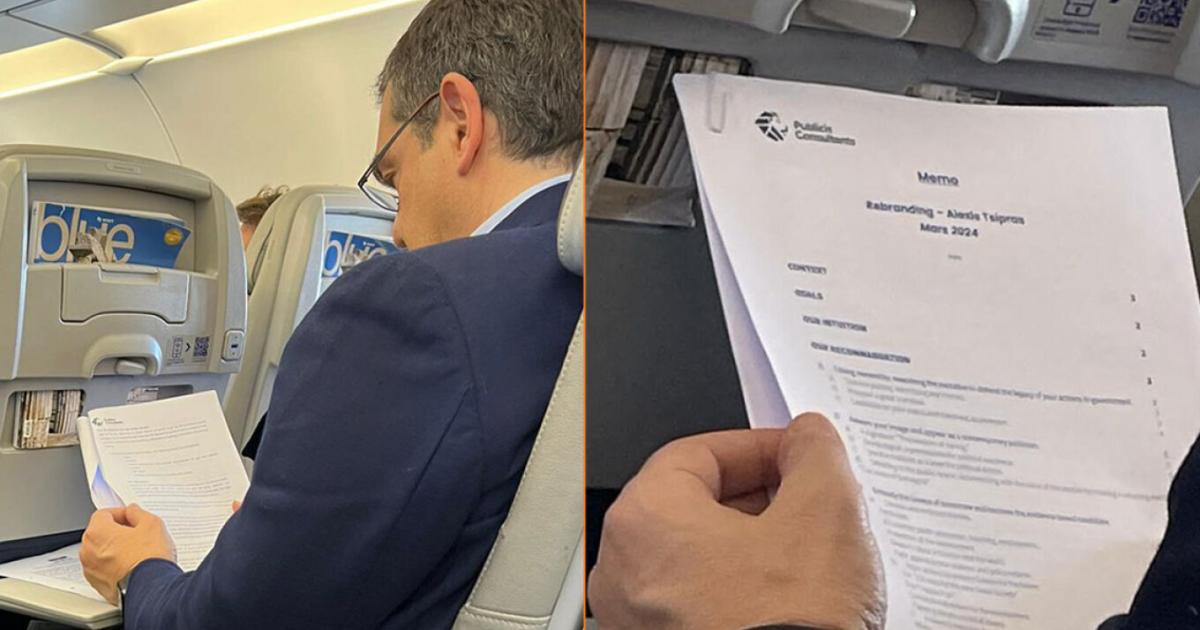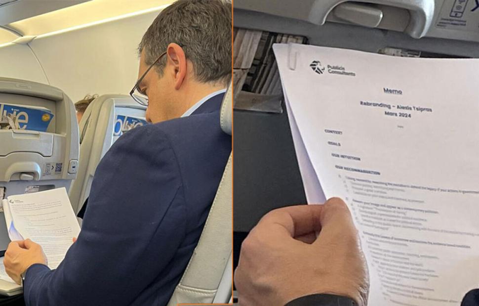 Από τη φωτογραφία που κυκλοφόρησε, ο πρώην πρωθυπουργός φαίνεται πως μελετούσε ένα ενημερωτικό μιας από τις μεγαλύτερες διαφημιστικές εταιρείες στον κόσμο, με έδρα το Παρίσι, της Publicis Communications, με τίτλο «Rebranding - Alexis Tsipras». Από κάτω γράφει «Mars 2024» (Μάρτιος 2024).