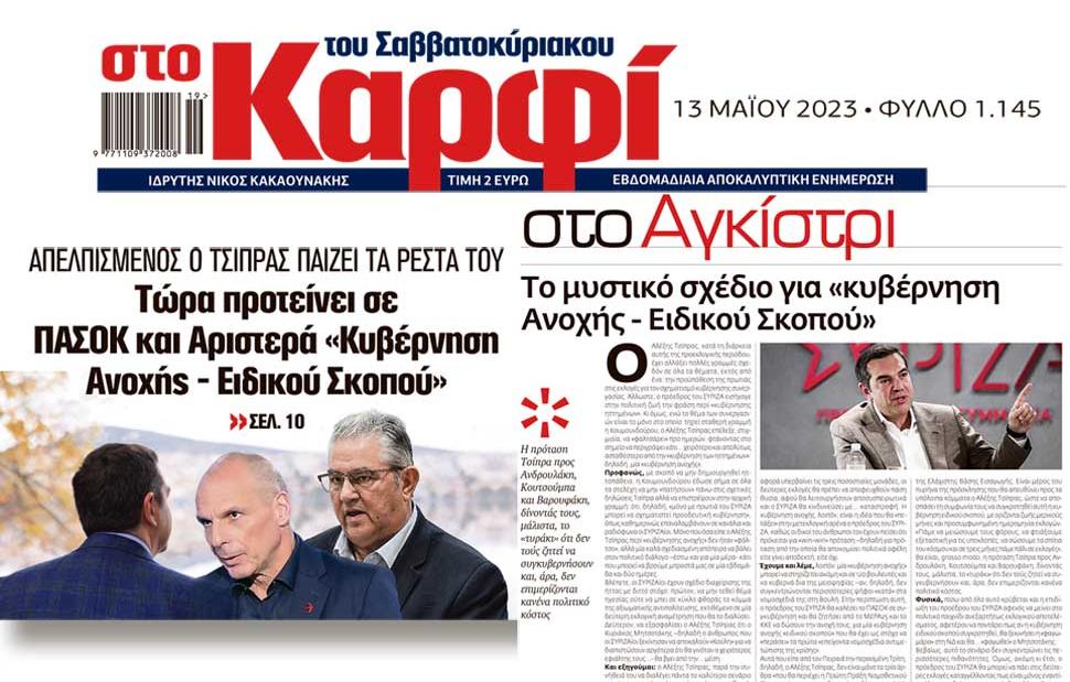 Βασικό πρωτοσέλιδο θέμα στην εφημερίδα «στο Καρφί» του περασμένου Σαββάτου (όπως μπορείτε να δείτε και στην φωτό) ήταν η αποκάλυψη της πρόθεσης του Τσίπρα να προτείνει τον σχηματισμό «Κυβέρνησης Ειδικού Σκοπού» με την συμμετοχή ή την ανοχή των κομμάτων της Αντιπολίτευσης.