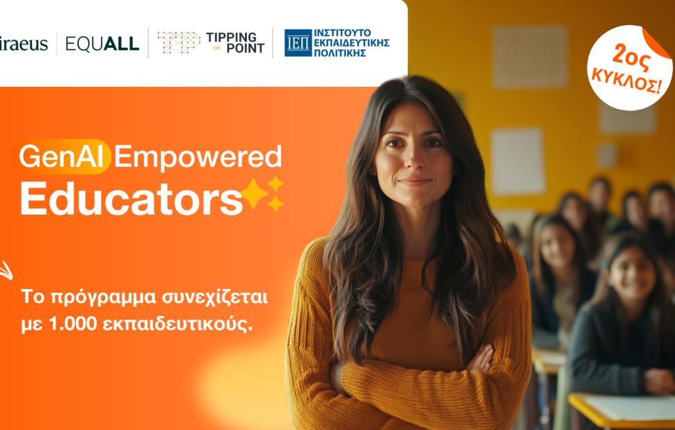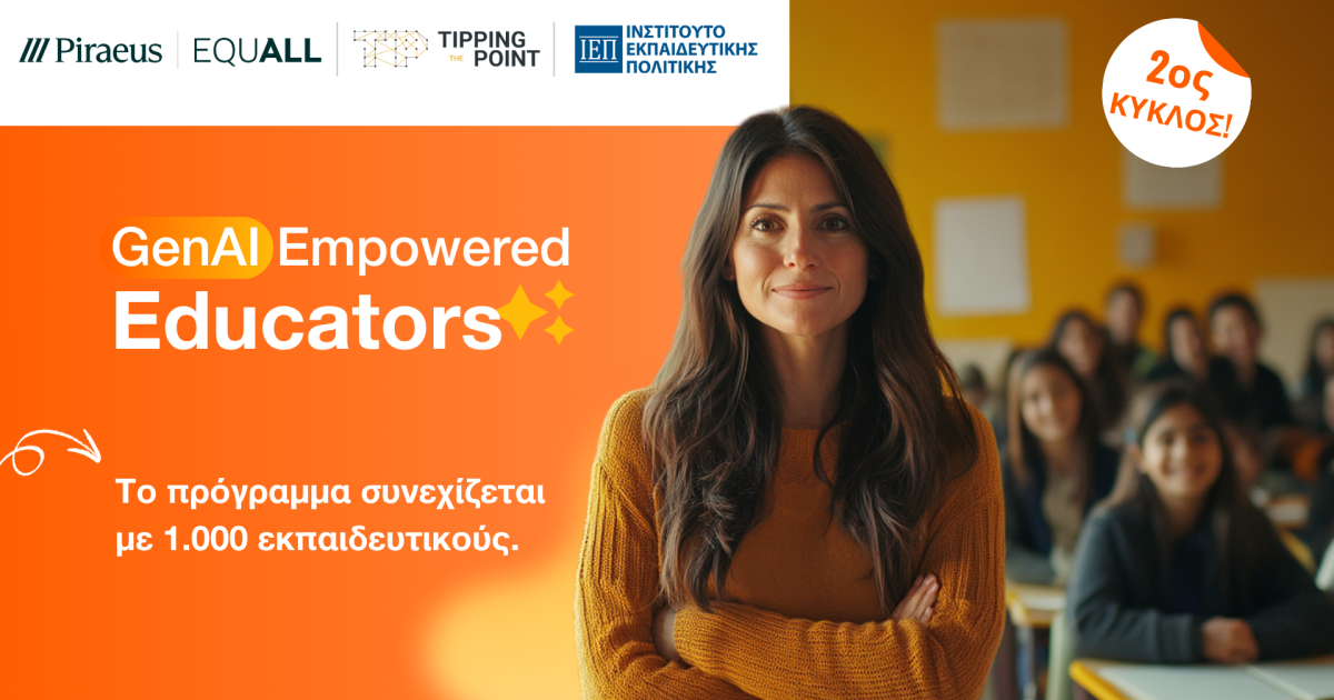 Η Πειραιώς, στο πλαίσιο του προγράμματος Εταιρικής της Υπευθυνότητας «EQUALL - Για μια Κοινωνία Ισότιμων Ανθρώπων» και τον πυλώνα της Νέας Γενιάς, υποστηρίζει για δεύτερη συνεχή χρονιά, το καινοτόμο διαδραστικό πρόγραμμα επιμόρφωσης εκπαιδευτικών «GenAI Empowered Educators» που υλοποιείται από τον οργανισμό The Tipping Point σε συνεργασία με το Ινστιτούτο Εκπαιδευτικής Πολιτικής (ΙΕΠ).