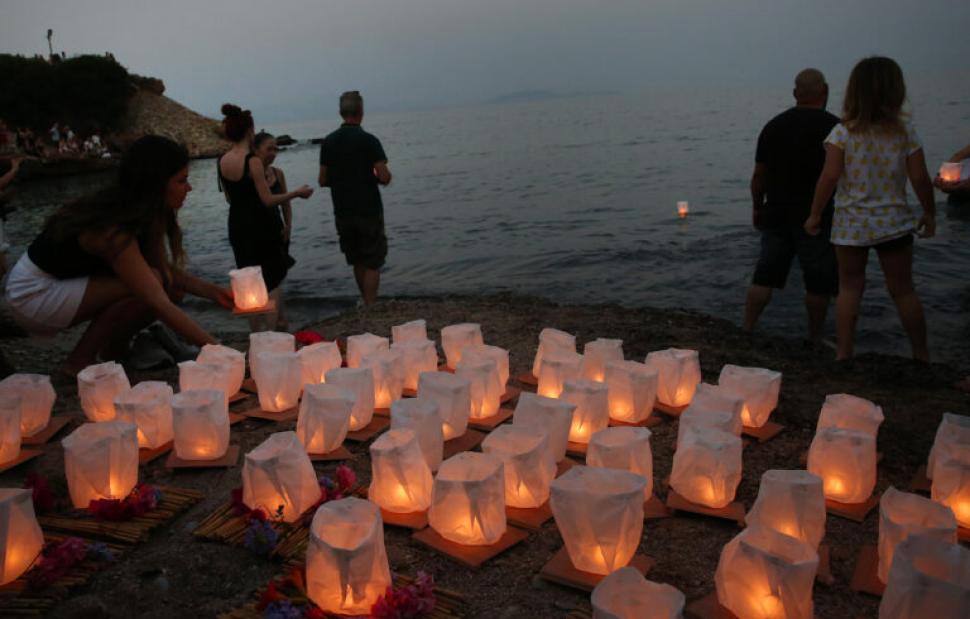 Παράλληλα, συγγενείς και φίλοι των θυμάτων της φονικής πυρκαγιάς στο Μάτι, άναψαν φαναράκια μέσα στη θάλασσα, κατά τη διάρκεια της τελετής μνήμης των θυμάτων.