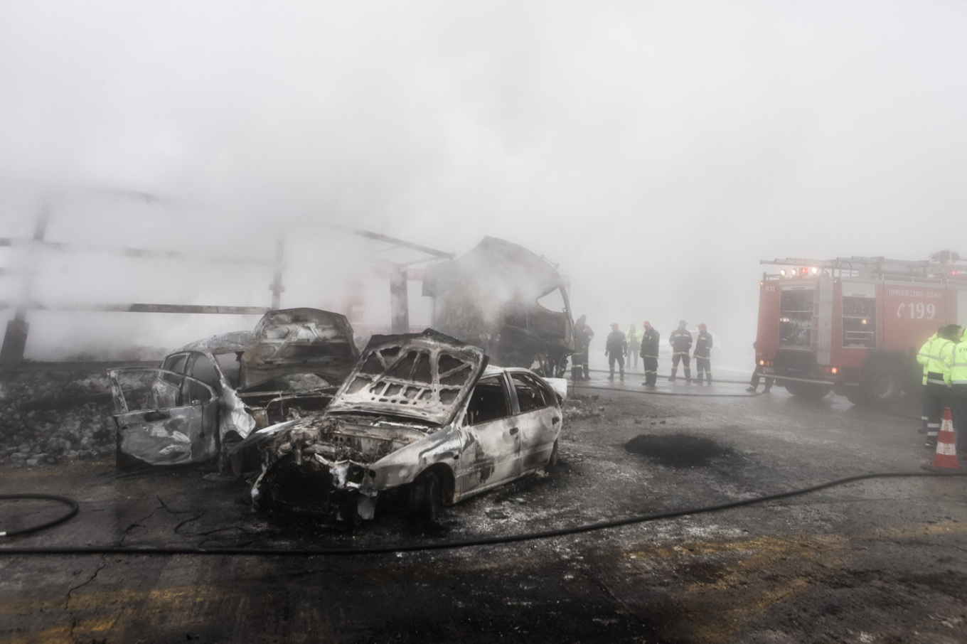 Εκείνη τη στιγμή ο οδηγός του δεύτερου αυτοκίνητο που ακολουθούσε, λόγω της ομίχλης δεν πρόλαβε να φρενάρει και έπεσε πάνω στο αυτοκίνητο που έκανε όπισθεν. Από τη σύγκρουση ξέσπασε αμέσως φωτιά και δύο άνθρωποι που επέβαιναν στα αυτοκίνητα απανθρακώθηκαν.