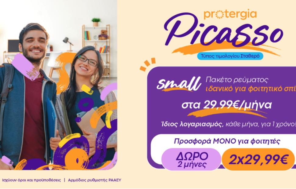 H φοιτητική ζωή είναι γεμάτη νέες εμπειρίες, στιγμές ξεγνοιασιάς, αλλά φέρνει μαζί και τις πρώτες ευθύνες. Το Protergia Picasso Student έρχεται να διευκολύνει την καθημερινότητα των φοιτητών, προσφέροντας σταθερό λογαριασμό ρεύματος με μόνο 29,99€ το μήνα.