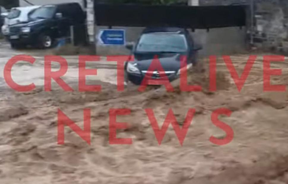 Ένα «ποτάμι» διαπερνά τους δρόμους στο Παλαιόκαστρο Ηρακλείου, συνέπεια της σφοδρής νεροποντής με τους κατοίκους στον δήμο Μαλεβιζίου να μην μπορούν να βγουν από τα σπίτια τους.