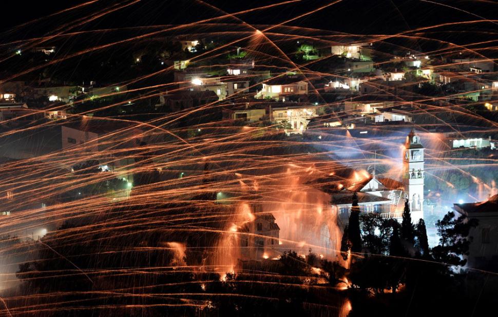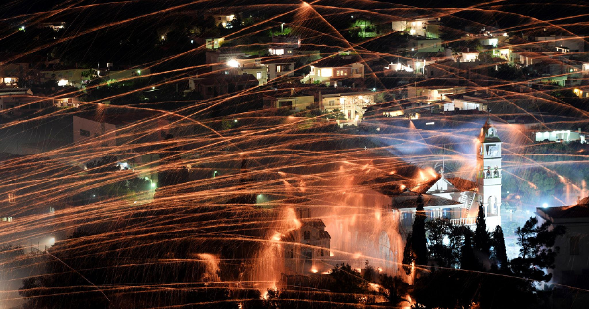 Ο ουρανός μετατράπηκε σε ένα εκρηκτικό σκηνικό φωτός και ήχου, δημιουργώντας εικόνες που θυμίζουν κινηματογραφική παραγωγή. Οι καμπαναριές των δύο εκκλησιών αποτέλεσαν τα βασικά σημεία στόχευσης, όπως ορίζει η παράδοση.