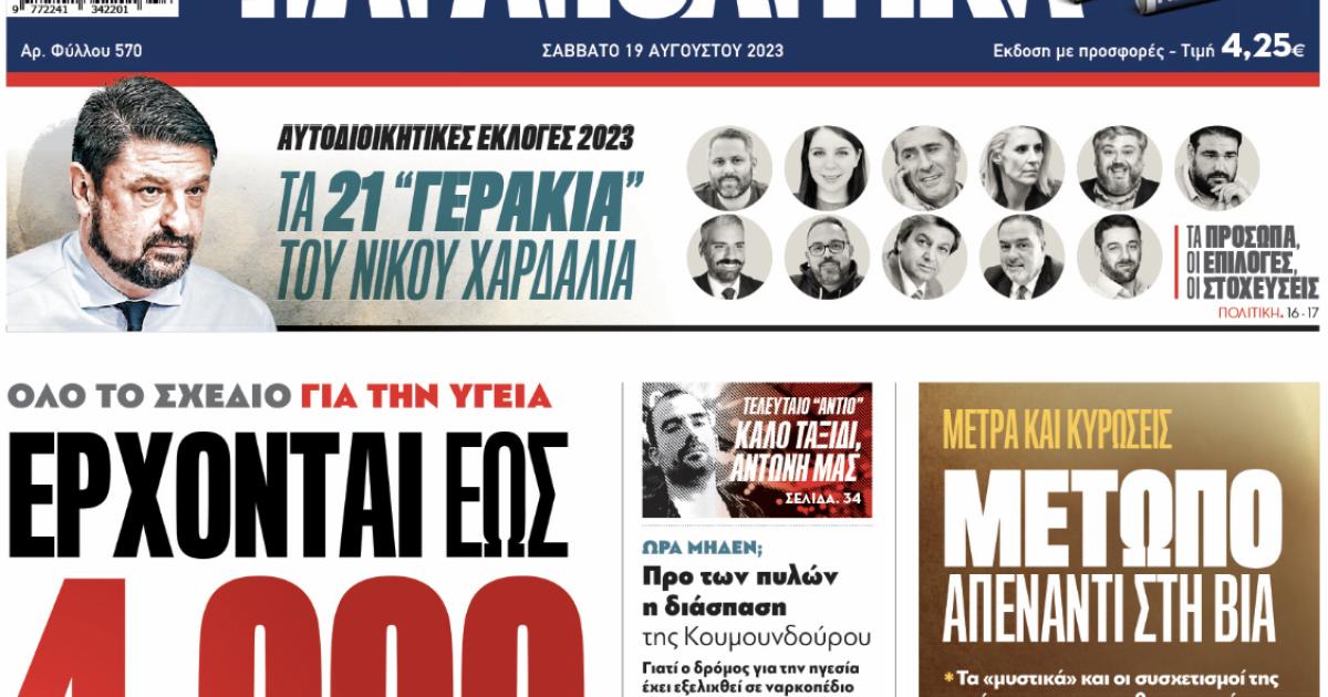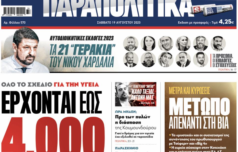 Με τίτλο: «Όλο το σχέδιο για την ΥΓΕΙΑ» , «Έρχονται έως 4.000 επιπλέον προσλήψεις» κυκλοφορούν αύριο, Σάββατο 19 Αυγούστου, τα «Παραπολιτικά».