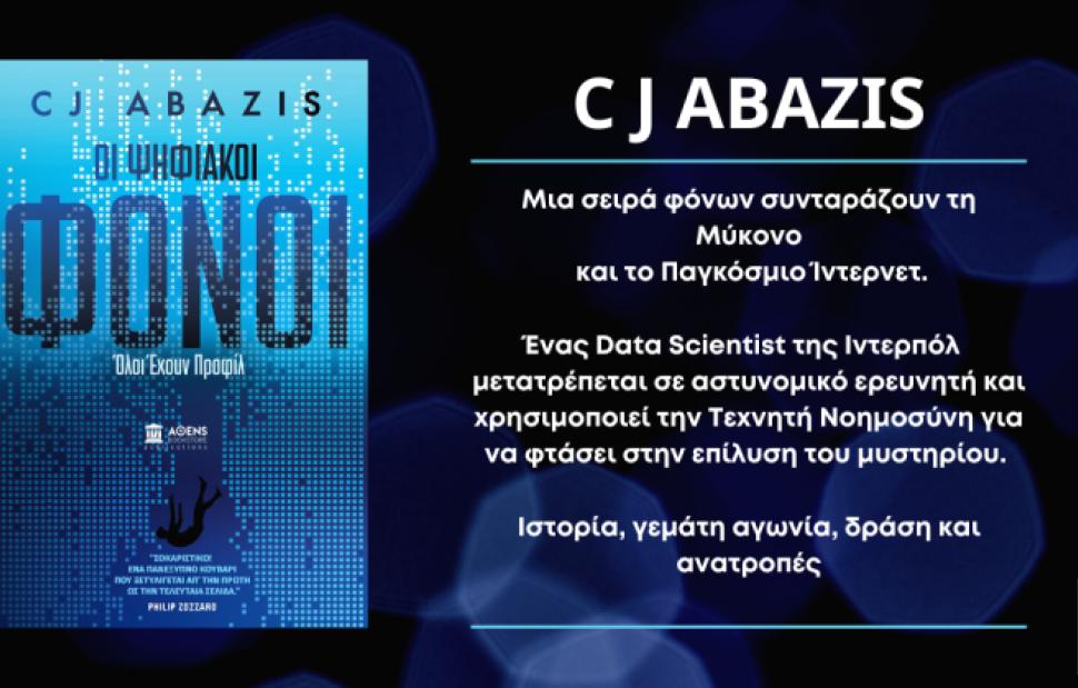 Από την AΘENS BOOKSTORE PUBLICATIONS κυκλοφορούν στην ελληνική γλώσσα "Οι Ψηφιακοί Φόνοι". Πρόκειται για το νέο μυθιστόρημα του εξαιρετικά ανερχόμενου συγγραφέα αστυνομικού μυθιστορήματος CJ ABAZIS, του οποίου τη συνεργασία εξασφάλισε ο εκδοτικός οίκος.