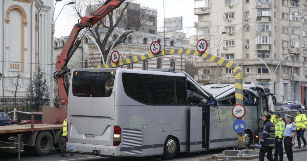Στιγμές πανικού ακολούθησαν την ώρα που το λεωφορείο χτύπησε στην πινακίδα ορίου για το ύψος στο Βουκουρέστι της Ρουμανίας και είχε ως αποτέλεσμα να συντριβεί το πάνω μέρος του οχήματος, αλλά και τον θάνατος ενός άνδρα.
