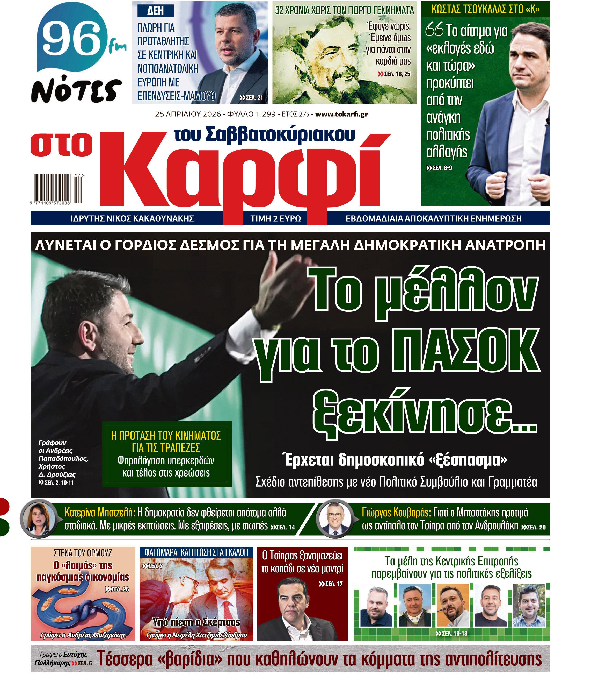 Μη χάσετε το Σάββατο 25 Απριλίου 2026 το αποκαλυπτικό «ΚΑΡΦΙ» που κυκλοφορεί σε όλα τα περίπτερα της χώρας με πλούσια θεματολογία και πολλές αποκλειστικότητες.