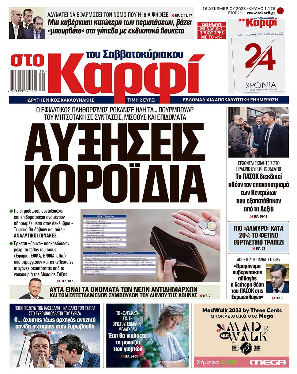 Μη χάσετε το Σάββατο 16 Δεκεμβρίου 2023 το αποκαλυπτικό «ΚΑΡΦΙ» που κυκλοφορεί σε όλα τα περίπτερα της χώρας με πλούσια θεματολογία και πολλές αποκλειστικότητες.