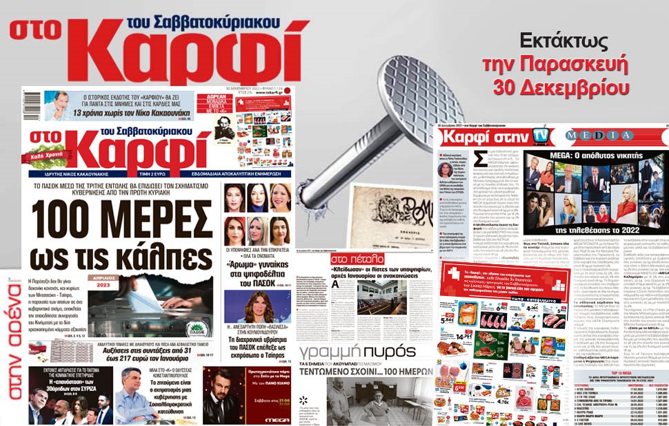 Μη χάσετε εκτάκτως την Παρασκευή 30 Δεκεμβρίου 2022 το αποκαλυπτικό «ΚΑΡΦΙ» που κυκλοφορεί σε όλα τα περίπτερα της χώρας με πλούσια θεματολογία και πολλές αποκλειστικότητες.