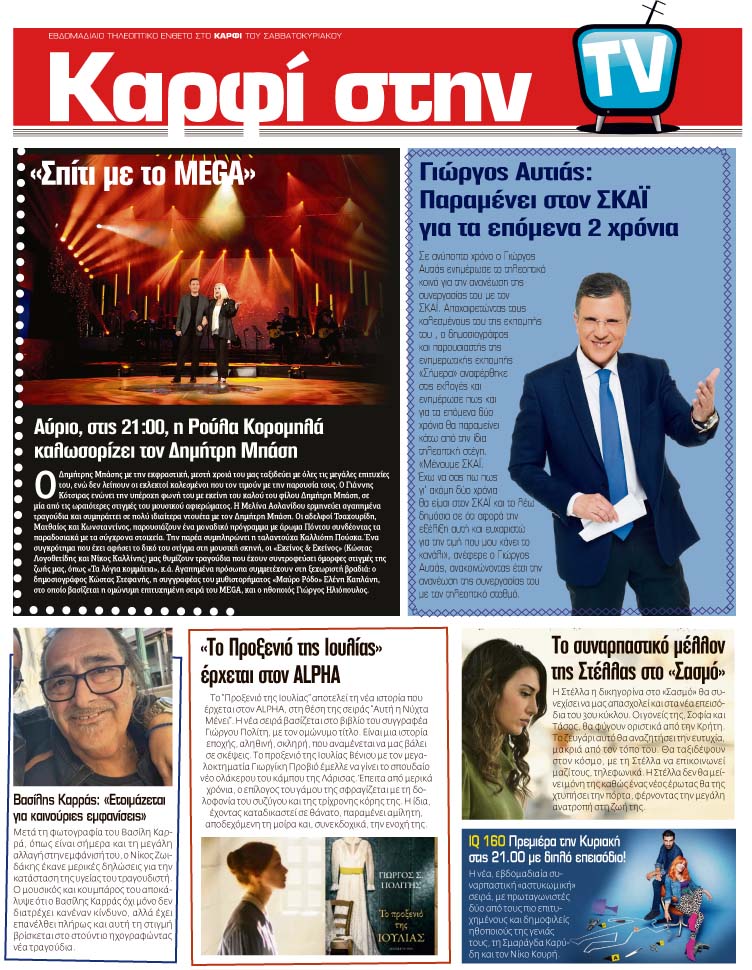 - ΚΑΡΦΙ στην TV. Μάθετε όλες τις εξελίξεις για τις τηλεοπτικές σειρές καθώς και τις ταινίες που θα προβληθούν – Ακόμη ενημερωθείτε για Τέχνες και Πολιτισμό