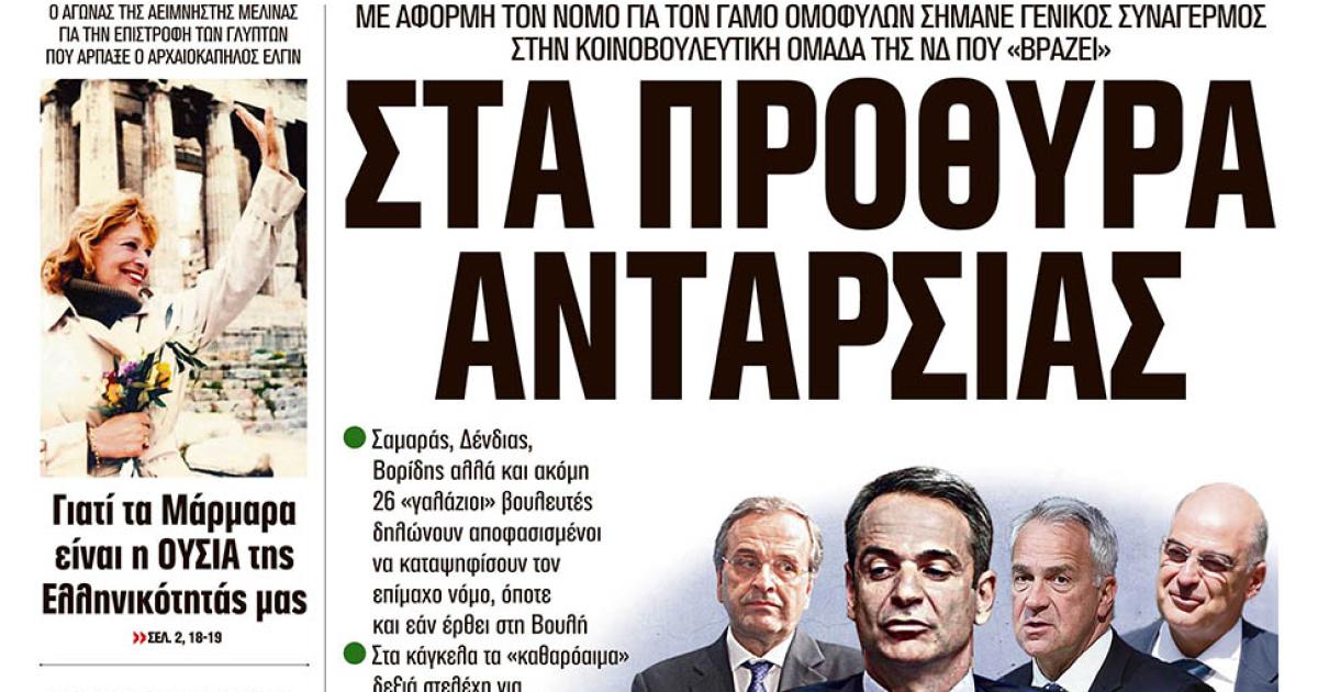 ΜΕ ΑΦΟΡΜΗ ΤΟΝ ΝΟΜΟ ΓΙΑ ΤΟΝ ΓΑΜΟ ΟΜΟΦΥΛΩΝ ΣΗΜΑΝΕ ΓΕΝΙΚΟΣ ΣΥΝΑΓΕΡΜΟΣ ΣΤΗΝ ΚΟΙΝΟΒΟΥΛΕΥΤΙΚΗ ΟΜΑΔΑ ΤΗΣ ΝΔ ΠΟΥ «ΒΡΑΖΕΙ»