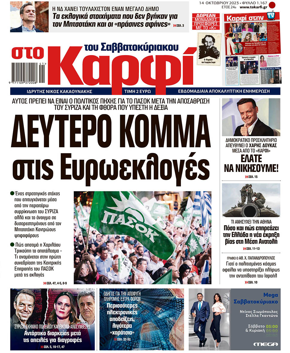 Μη χάσετε το Σάββατο 14 Οκτωβρίου 2023 το αποκαλυπτικό «ΚΑΡΦΙ» που κυκλοφορεί σε όλα τα περίπτερα της χώρας με πλούσια θεματολογία και πολλές αποκλειστικότητες.