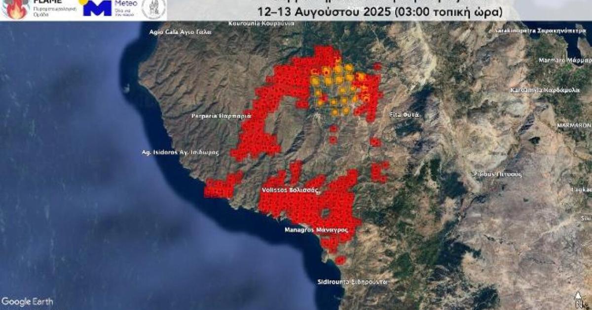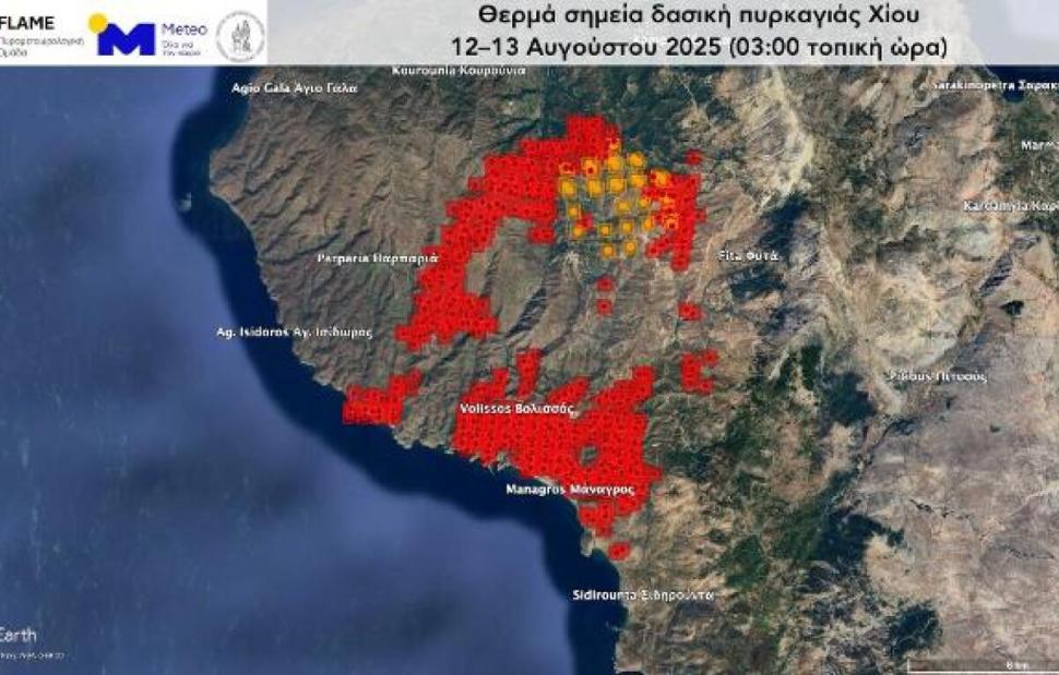 Τα στοιχεία προέρχονται από τα θερμά σημεία που ανίχνευσε το όργανο VIIRS (Visible Infrared Imaging Radiometer Suite) των δορυφόρων πολικής τροχιάς SUOMI, NOAA-20 και NOAA-21 στις 3:00 τα ξημερώματα σήμερα, Τετάρτη.