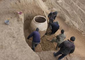 Ένα τεράστιο πιθάρι ύψους 1.75 μέτρων, γνωστό ως «hum», κατά τη διάρκεια πρόσφατων αρχαιολογικών ανασκαφών στην πόλη Ούζγκεν στην επαρχία Ος της Κιργι...