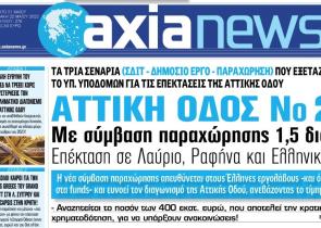 Με τίτλο: «Αττική οδός Νο2» κυκλοφορεί αύριο, Σάββατο 21 Μαΐου, η «Axianews». Με σύμβαση παραχώρησης 1,5 δισ. - Επέκταση σε Λαύριο, Ραφήνα και Ελλη...