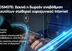 Ξεκινά η σταδιακή δωρεάν αναβάθμιση ταχυτήτων του σταθερού ευρυζωνικού internet για οικιακούς και εταιρικούς συνδρομητές COSMOTE, σε περιοχές που δεν ...