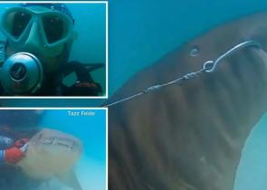 Ένας γενναίος δύτης από τη Φλόριντα απελευθέρωσε έναν καρχαρία. Ο καρχαρίας είχε έναν μεγάλο γάντζο στο στόμα του και είχε παγιδευτεί σε μια πετονιά σ...