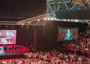 Καταχειροκροτούμενος και υπό τους ήχους του αλβανικού ύμνου μπήκε στην αίθουσα στο Κλειστό Γαλατσίου ο Έντι Ράμα, κατά την προεκλογική φιέστα στην Αθή...