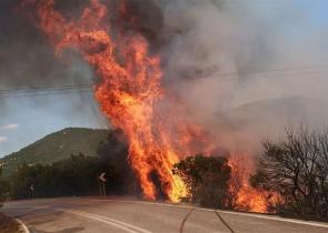 Από τις πρώτες πρωινές ώρες στην περιοχή επιχειρούν ισχυρές δυνάμεις κατάσβεσης, επίγειες και εναέριες, προσπαθώντας με συνεχόμενες ρίψεις νερού να αν...