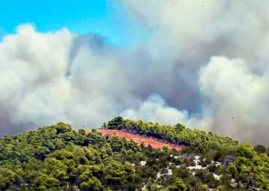 Ισχυρές επίγειες και εναέριες πυροσβεστικές δυνάμεις στην περιοχή. Στην περιοχή πνέουν ισχυροί άνεμοι και η ατμόσφαιρα από τους καπνούς είναι αποπνικτ...