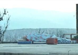 Σε ένα αυτοσχέδιο στρώμα, καλυμμένος με ένα σεντόνι κοιμάται ένας άνθρωπος πάνω στο καμένο του σπίτι στο Τσακάλι Μάνδρας, έπειτα από την καταστροφική ...