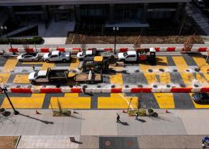 Εργάτες άρχισαν την Δευτέρα στην Ουάσιγκτον να αφαιρούν πελώρια επιγραφή στα χρώματα του κινήματος αντιρατσιστικής διαμαρτυρίας Black Lives Matter σε...