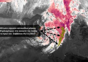 Πλησιάζει τη δυτική Ελλάδα η κακοκαιρία «Eva» που ξεκίνησε από την Ιταλία. Χάρτης ότι το μεσημέρι του Σαββάτου, μέτωπο ισχυρών καταιγίδων μήκους 900 χ...