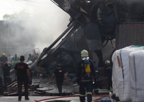 Προειδοποίηση στους κατοίκους από το 112 να κρατήσουν κλειστά τα παράθυρα λόγω του καπνού. Η φωτιά κατέστρεψε την αποθήκη υλικών του εργοστασίου.