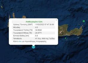Σεισμός μεγέθους 4 βαθμών της κλίμακας Ρίχτερ σημειώθηκε νότια από την Κρήτη, σύμφωνα με εκτίμηση του Γεωδυναμικού Ινστιτούτου του Εθνικού Αστεροσκοπε...