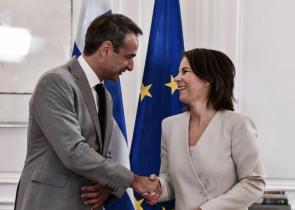 Την υπουργό Εξωτερικών της Γερμανίας, Αναλένα Μπέρμποκ, υποδέχτηκε στο Μέγαρο Μαξίμου στις 10:30 το πρωί ο Πρωθυπουργός, Κυριάκος Μητσοτάκης. Ο Κυρ...