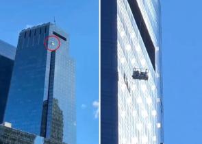 Στιγμές τρόμου έζησαν δύο καθαριστές παραθύρων που παγιδεύτηκαν σε σπασμένα ικριώματα ουρανοξύστη στο Μανχάταν. Το βίντεο τους δείχνει να μετακινο...