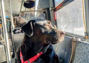 Η Eclipse στο λεωφορείο. Οι συνεπιβάτες απολάμβαναν να χαϊδεύουν το κουτάβι κατά τη διάρκεια της μετακίνησής τους. Αυτή είναι μια συνηθισμένη λεζάντα ...