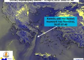 Ακόμα και στα Κύθηρα έχει φτάσει ο καπνός από τη φωτιά στην Πεντέλη. Ο καπνός μεταφέρθηκε έως και 400 χιλιομέτρων. Οπτική δορυφορική εικόνα του met...