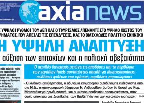 Με τίτλο: «Η υψηλή ανάπτυξη, η αύξηση των επιτοκίων και η πολιτική αβεβαιότητα» κυκλοφορεί αύριο Σάββατο 10 Σεπτεμβρίου η «Axianews». Οι υψηλοί ρυθ...