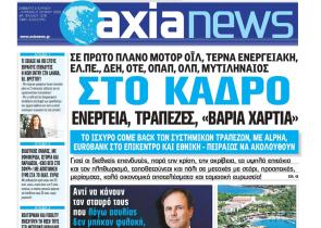 Με τίτλο: Στο κάδρο Ενέργεια, Τράπεζες, «βαριά χαρτιά» κυκλοφορεί αύριο, Σάββατο 4 Ιουνίου η «Axianews». Σε πρώτο πλάνο Μότορ Όιλ, Τέρνα Ενεργειακή...