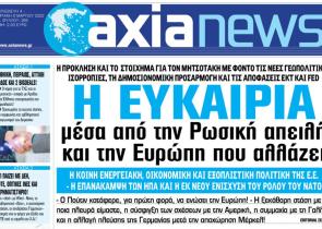 Με τίτλο: «Η ευκαιρία μέσα από τη Ρωσική απειλή και την Ευρώπη που αλλάζει» κυκλοφορεί εκτάκτως αύριο Παρασκευή 4 Μαρτίου 2022, η «Axianews». Η πρό...