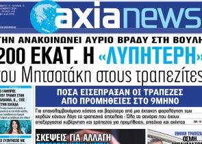 Με τίτλο: «200 εκατ. η "λυπητερή" του Μητσοτάκη στους τραπεζίτες» κυκλοφορεί αύριο, Σάββατο 7 Δεκεμβρίου, η «Axianews». Την ανακοινώνει την Κυριακή...