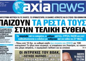 Με τίτλο: «Παίζουν τα ρέστα τους στην τελική ευθεία» κυκλοφορεί το Σάββατο 6 Μαΐου η «Axianews». Η αντίστροφη μέτρηση για τις εκλογές, το Χρηματιστ...