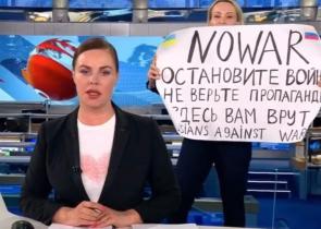 Μία Ρωσίδα διαδηλώτρια κρατώντας στα χέρια της ένα πλακάτ που έγραφε «όχι στον πόλεμο» μπήκε στο στούντιο της ρωσικής κρατικής τηλεόρασης και διέκοψε ...