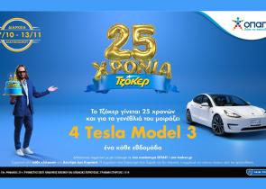 Το ΤΖΟΚΕΡ γίνεται 25 χρόνων και γιορτάζει τα γενέθλιά του μοιράζοντας 4 αυτοκίνητα TESLA Model 3. Από τις 17 Οκτωβρίου έως και τις 13 Νοεμβρίου, 4 τυ...