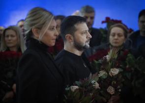 Ο Ουκρανός πρόεδρος Βολοντίμιρ Ζελένσκι έδωσε το παρών κατά τη διάρκεια της αποχεραιτιστήριας τελετής των θυμάτων της συντριβής του ελικοπτέρου στην π...