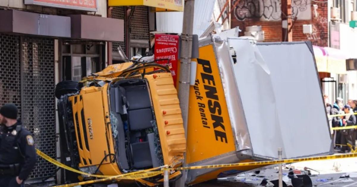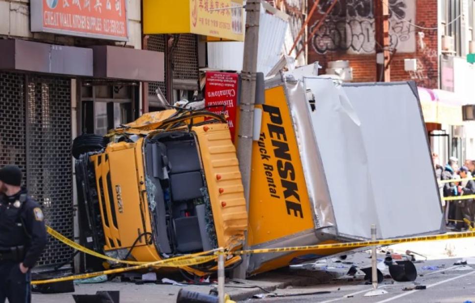 Όπως αναφέρει το Fox News, το φορτηγό - ένα κίτρινο ενοικιαζόμενο φορτηγό της εταιρείας Penske - χτύπησε πολλούς στύλους και γύρισε στο πλάι, πριν σφηνωθεί μεταξύ ενός στύλου και ενός κτιρίου.