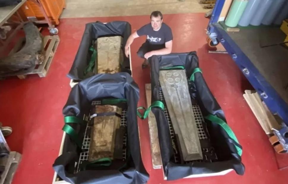 Μία από τις ταφόπλακες που ανελκύστηκαν. Η ομάδα του Μπόρνμουθ σχεδιάζει να συνεχίσει την εξερεύνηση και την προστασία του ναυαγίου κατά τα επόμενα χρόνια, με στόχο να καταγράψει τελικά τον καλά διατηρημένο ξύλινο σκελετό του κύτους του πλοίου, που εξακολουθεί να είναι ενσωματωμένο στην άμμο.